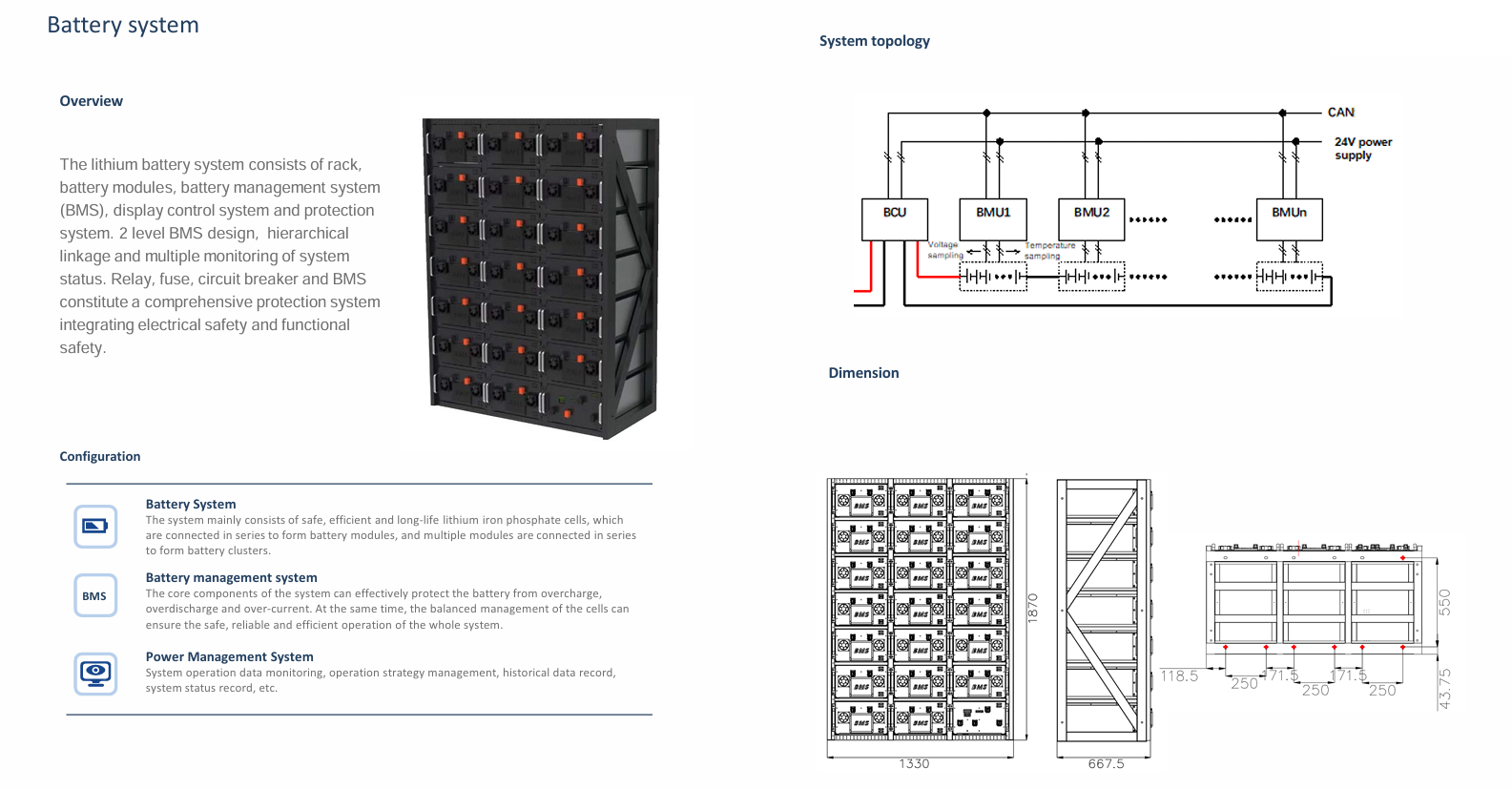 The system mainly consists of safe, efficient and long-life lithium iron phosphate cells, which are connected in series to form battery modules, and multiple modules are connected in series to form battery clusters.